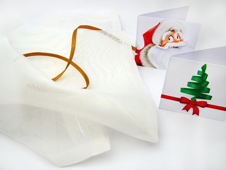 Organza tasak 1 db ajándékkísérő kártyával (mikulás minta) és 1 db arany színű szalaggal.